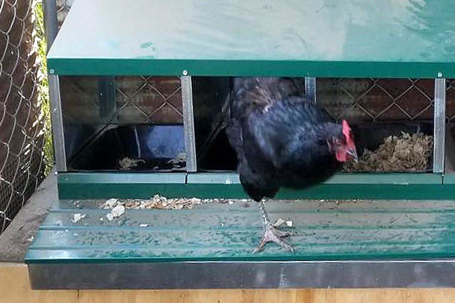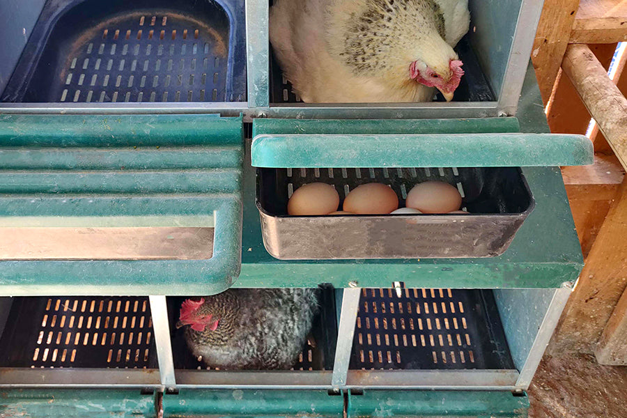 - Roll away trays pitched forward to safely guide eggs away from nest
